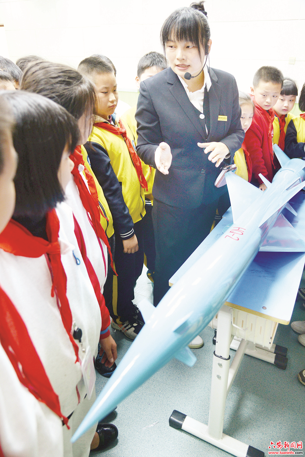 图为工作人员结合巡航导弹模型,为金安区人民路小学北校的同学们介绍航天航空和国防科技知识。