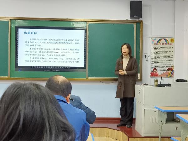 上午8时30分,小学语文、小学数学两科集中培训按时开课,培训按语文数学两个学科分别在两个教室同时进行。小学语文培训由李菊授课,课题为《自主专业反思能力培养》;小学数学由王宗梅授课,课题为《知行合一,做反思型教师》。专家们从教育教学层面给老师们做了梳理,同时还从不同角度举了很多精彩的例子,使受训教师们受益匪浅,为东桥镇今后各小学教育教学质量的更上一层楼奠定了坚实的基础。