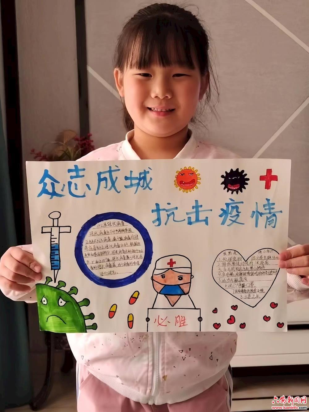 我叫王雨琦,是六安市梅花小学一(6)班学生,我的爸爸是一名急诊科医生,他已经17天没有回家了,4月4号早晨一起来我就没看见爸爸在家了,妈妈说爸爸夜里就走了,病毒又来感染我们的城市了,爸爸要去医院和同事们一起去打败它。我的印象中好像每次病毒来的时候爸爸都不在家,我非常想念爸爸,晚上我发视频给他,问他为什么不回来陪我和姐姐、妈妈,爸爸说他要在医院帮助生病的人。在电视机看见有很多医生叔叔和护士阿姨穿着白色的防护服,很辛苦,我想这里面肯定有我的爸爸。我问爸爸:病毒来了你害怕吗?爸爸说:我肯定也害怕啊,但是爸爸是医生,这是我的责任,希望你长大了,工作了也要坚守你的责任。爸爸说的我不太懂,但我觉得长大了也要做一个能帮助别人的人。