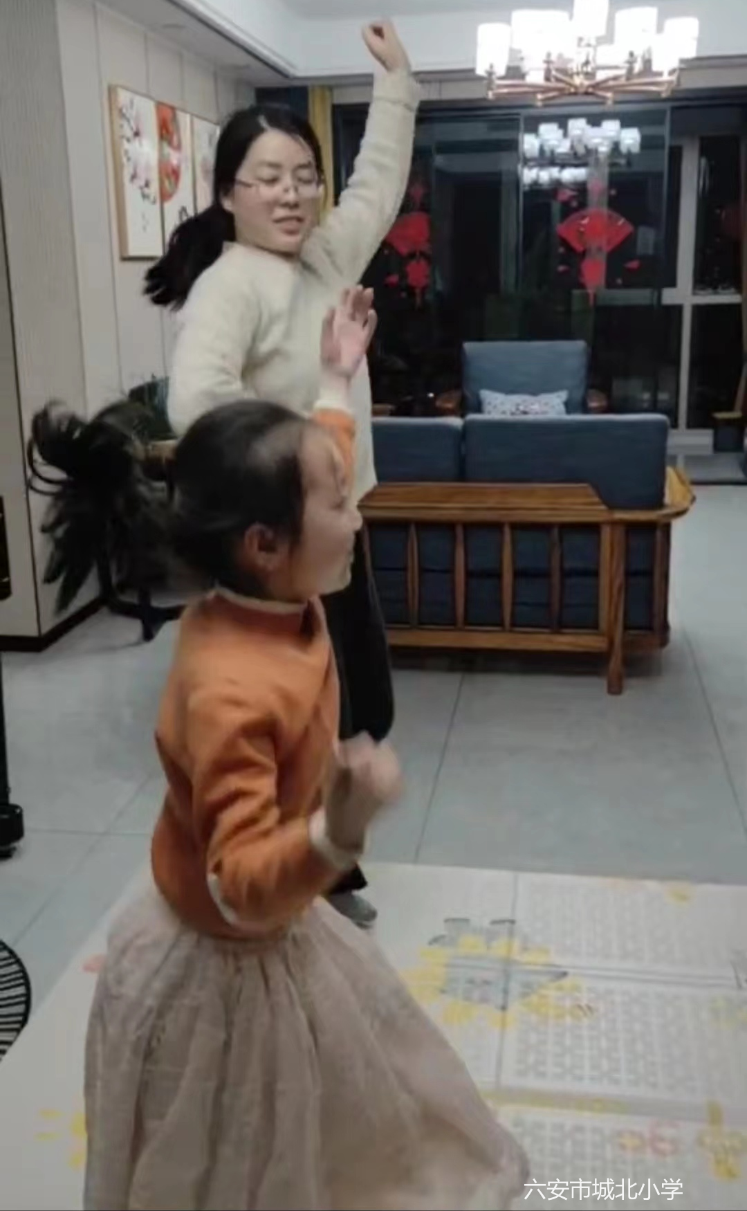 我们鼓励孩子邀请家长一起跳课间操《一起向未来》,营造了浓浓的健康和谐的家庭氛围。