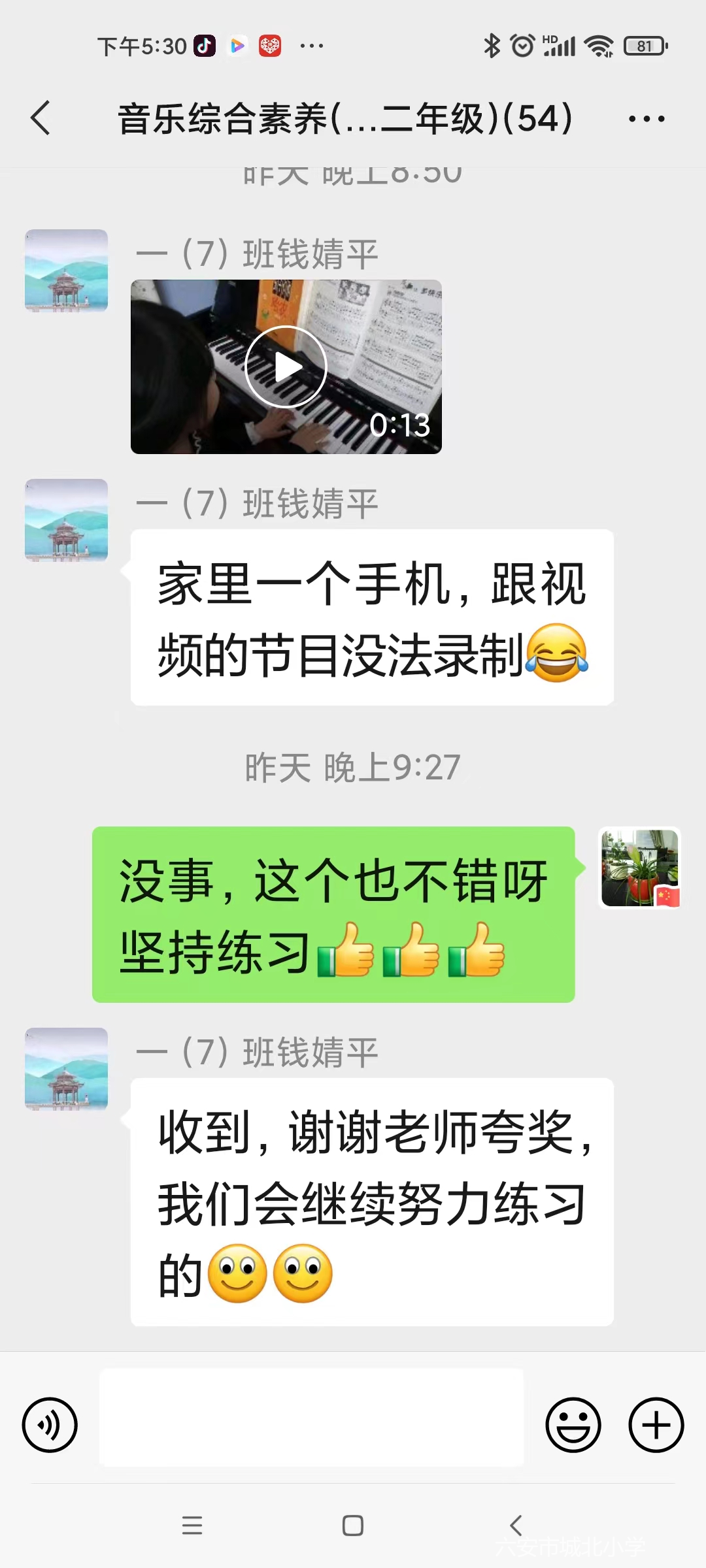 高质量的平台课保证了孩子们基础音乐课的学习,每次课后孩子们及时在群里反馈学习情况。疫情虽然让教学隔着屏幕,但孩子们学习的热情却让这隔屏相望有了温度。