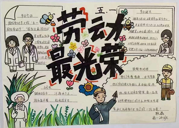 因处于居家线上学习阶段,被隔离在家的同学们通过网络观看“五一”劳动节相关视频资料,学习身边感人的劳动故事,共同了解 “五一”国际劳动节的由来,从而懂得生活离不开劳动,需要用自己勤劳的双手和聪慧的大脑来美化校园和家园。此外,同学们还通过手抄报、绘画等形式,向各行各业的劳动者、疫情中涌现出的无数新时代劳动者致敬,他们守初心、担使命,消除前进的困难和障碍,彰显最美劳动者本色。