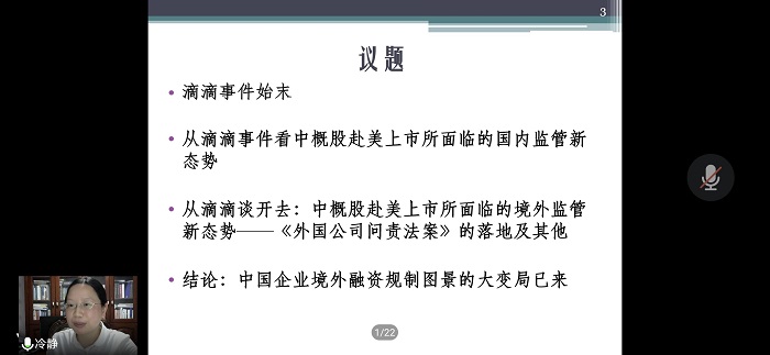 2022年5月6日晚,应皖西学院法学院邀请,上海市高校东方学者、华东政法大学国际金融法律学院教授,中国证券法学研究会常务理事、上海市经济法学研究会副会长冷静做客皖西学院“政法周末大讲堂”第164期,作“从滴滴事件看中国企业离岸融资规制的新图景”专题讲座。来自皖西学院校内外近200名师生和实务界人士聆听了此次讲座,法学院院长刘鑫主持讲座并作总结。