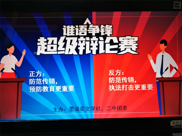 此次活动双方辩手均来自高一年级,辩论开始,正反方辩手,就“防范传销,是预防教育重要还是执法打击重要”展开了激烈辩论。辩论赛包含陈词质询、自由辩论、总结陈词三个环节,在此基础上还加入“奇袭”环节,使比赛更添趣味。双方辩手引经据典,出其不意的“攻”与“防”给现场评委留下了深刻的印象。“道越辩越清、理越辩越明”,最终达成辩论共识:防范传销必须预防为先、打击跟进,二者同等重要、缺一不可。