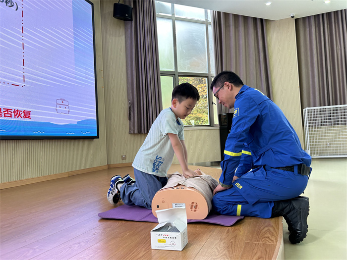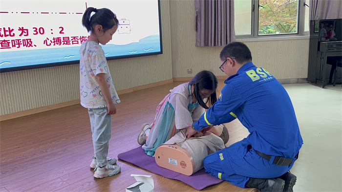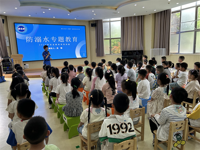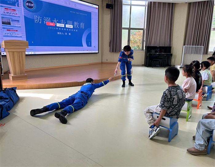 活动中,救援队的老师以通俗易懂的语言,利用生活中常见的水源和容易落水的地点,结合相关溺水案例,从“什么是溺水”“如何营救溺水者”“溺水如何自救”等方面,向师生普及了防溺水与溺水救援方面知识的介绍。孩子们认真倾听,在互动问答中,了解正确、有效的自救技能,进一步增强了自我安全意识。
