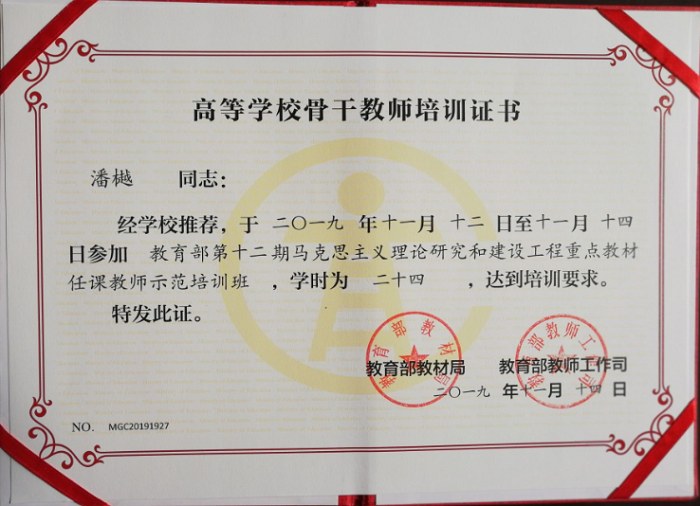 11月11日-14日,教育部第十二期马克思主义理论研究和建设工程(简称“马工程”)重点教材(新出版9种教材)任课教师示范培训班在北京开班。经学校推荐、省教育厅遴选,我校法学院法学专业负责人潘樾参加了《刑法学》重点教材的示范培训。