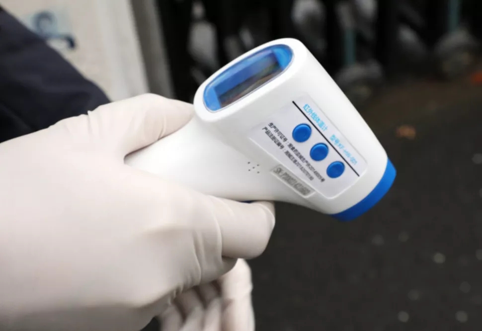 老师们模拟高三“学生”,入校时,校门口值班教师引导学生保持间隔一米,学生排队通过体温监测点。老师们对学生逐一进行体温监测,体温正常人员可以通过。