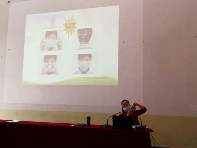 张琼同志利用PPT、图文并茂地从勤洗手、戴口罩、穿防护服、不扎堆、强健体五个部分作专题培训,张琼同志就日常生活中七步正确洗手方法、正确戴口罩、摘口罩、临时保管口罩方法进行了演示讲解,对照图片分步骤讲解了如何正确穿防护服、安全脱防护服,张琼讲解了不同场所和物品使用消毒液的正确配比方法,张琼还演示、讲解了正确使用水银温度计测体温的方法。
