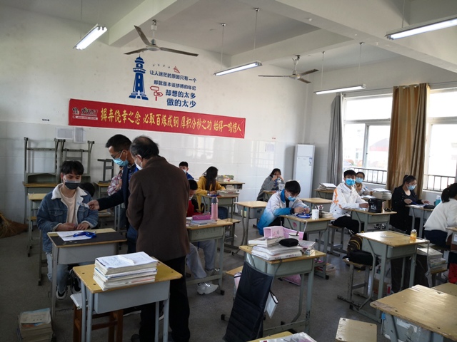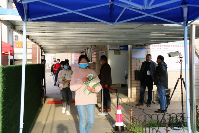 根据学校统一部署,从上午6:30开始,高三年级学生分班、分时段陆续返校报到。学生在学校大门口将行李物品经消毒后交物品接送处由专职工作人员负责接送到寝室,学生从人员进出校园通道入口经红外自动测温仪测量体温后进入校园,在进入大门口设置有进校学生洗手处、在图书馆一楼设置有隔离观察室与卫生间、学生进入教学楼有A、B通道,目前已有半数学生已经顺利返校,已经按照A、B班分班名单进入教室自习。
