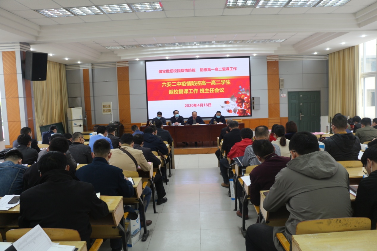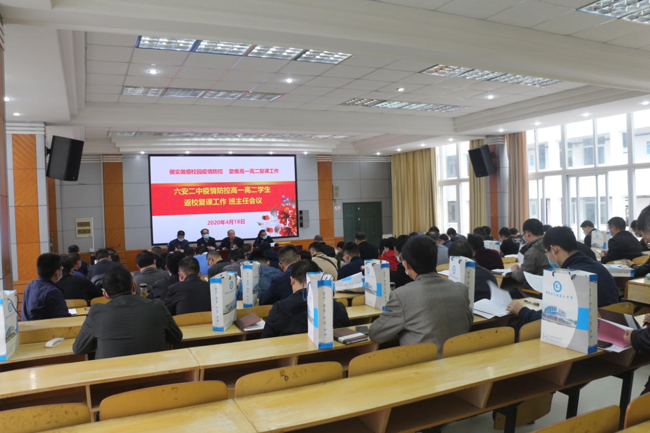为了精准精细做好疫情防控,有力有序助推复课开学工作,4月18日上午9时,六安二中在博学楼二楼阶梯教室召开了高一、高二年级班主任工作会议。会议由校长关世宏主持,副校长李守宏、尤奇志、罗会武,各处室负责人,高一、高二年级部负责人,高一、高二年级全体班主任参加会议。与会人员均佩戴口罩,间隔就座。