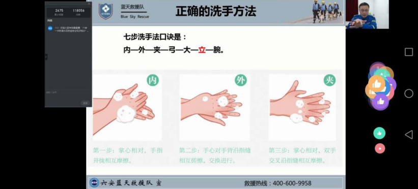 随着气温逐渐升高,我市已进入溺水事故的多发期;同时随着学生陆续返校,该校的防疫工作也面临挑战。为普及防溺水和防疫安全知识,增强学生自我防护能力,4月18日六安一中邀请了六安市蓝天救援队龚老师通过钉钉直播平台为全校学生做了一场安全知识讲座。