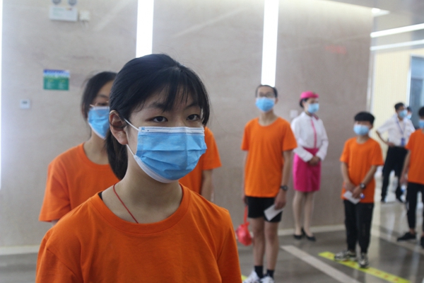 考生们在各生源学校领导和班主任的带队和护送下,配戴口罩,陆续到达考点,在“考生通道”有序排队,接受体温检测,洗手消毒,保持1米间距排队进入考场。