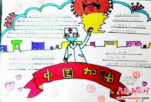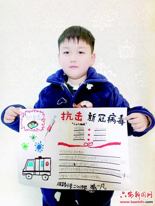 当新型冠状病毒感染的肺炎疫情防控正处于关键时期,金安区人民路小学积极响应团市委、少先队市工委《关于动员全市学校共青团和少年队开展助力抗疫活动的通知》要求,校少先大队组织全校少先队员在学校、老师的引导下,在和家人一齐做好自身防护的同时,纷纷以“抗疫”为主题,制作小视频、书法绘画、小作文、演讲朗诵等作品,并通过微信、微博、QQ、抖音等新媒体平台向社会广泛宣传“抗疫”知识和正能量,共同营造万众一心共抗疫情的浓厚氛围。(吴立俊 文/图)
