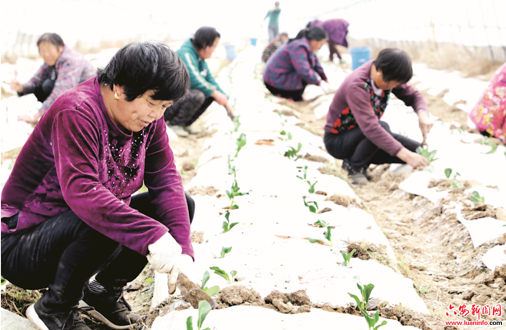 叶集区三元镇安徽庆顺蔬菜种植专业合作社100多亩的蔬果大棚里工人们正在忙着栽种花菜苗。由该镇四林村、新塘村、祖师庙村、沣桥村四村联动发展的村集体经济已初见效益。