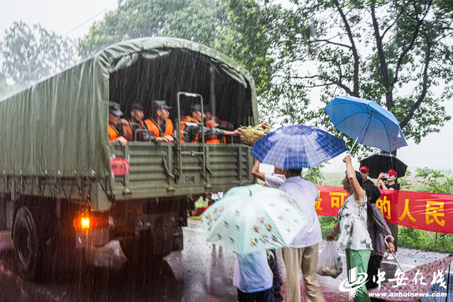 枞阳的抗洪抢险任务完成后,部队将赶往庐江县继续执行抗洪抢险任务。7月27日早上7点,听到解放军要走的消息,枞阳群众冒雨前来,夹道欢送。