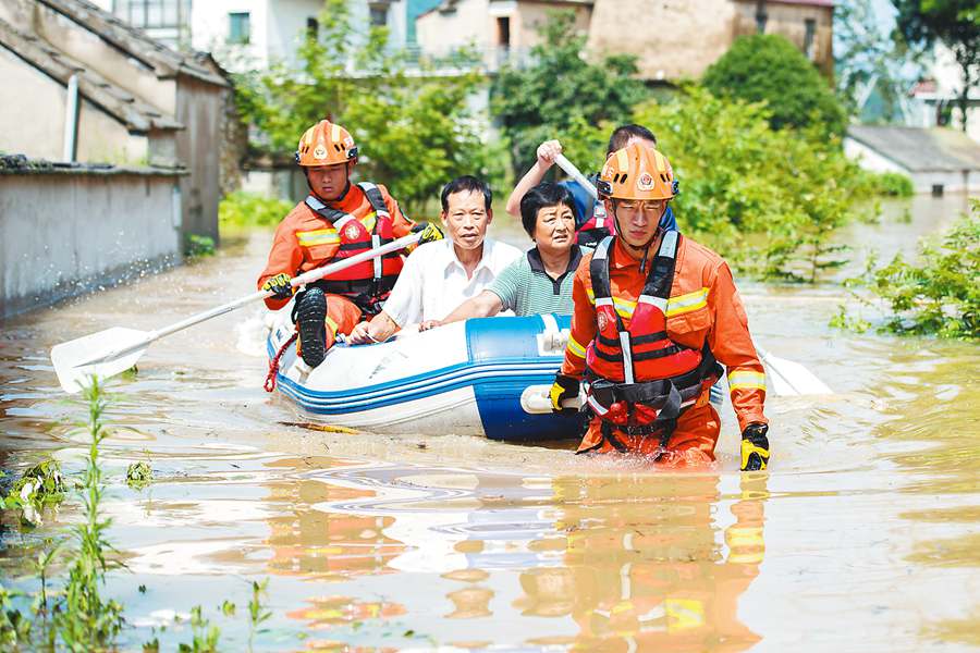 转移安置受灾群众,我省坚持不漏一户、不落一人。图为繁昌县消防救援大队搜救人员在孙村镇代亭村转移受困群众。通讯员 肖本祥/摄
