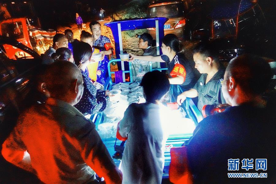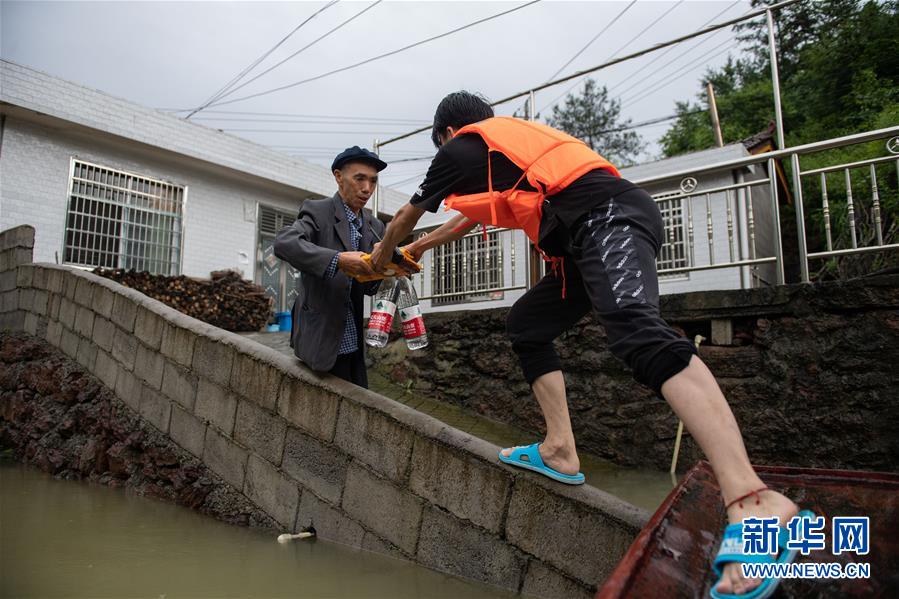 7月7日,湖南省常德市石门县雁池乡重福桥村的干部(右)为被困群众运送生活物资。新华社记者陈思汗摄
