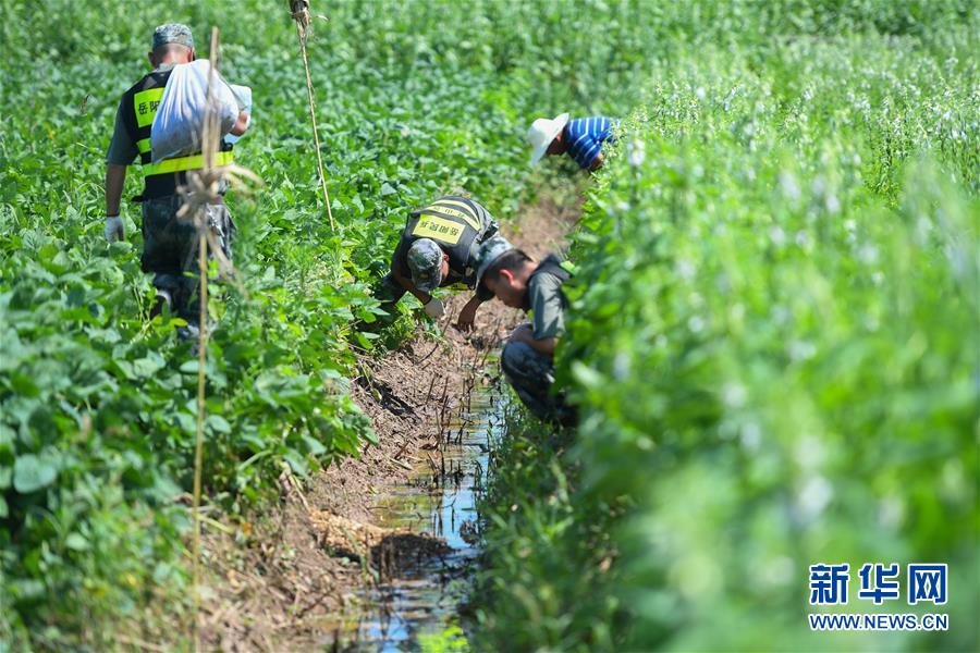 7月27日,在安徽蒙洼蓄洪区东田坡庄台,驻庄台医生韦一伟(左)、临时党支部书记王伟(中)在庄台上走访。新华社记者黄博涵摄