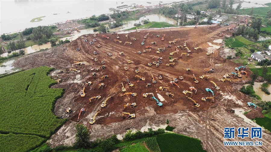 7月28日,在安徽阜阳市姜唐湖蓄洪区戴家湖一处涵闸险情处置现场,人们操作机械设备在抢筑临时圩堤(无人机照片)。新华社记者黄博涵摄