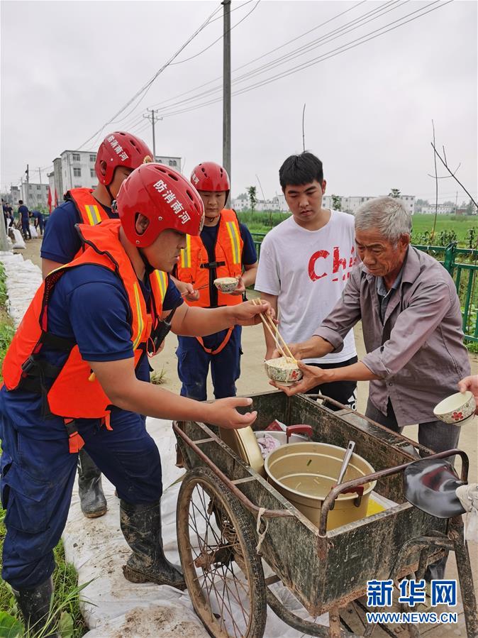 安徽铜陵市,群众自发为正在加固堤坝的武警官兵送去煮好的鸡蛋;