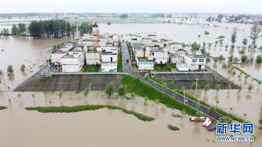 这是被洪水包围的安徽省阜南县曹集镇西田坡庄台,蓄洪区内的所有庄台上都有党员干部值守(7月24日摄,无人机照片)。新华社记者张端摄