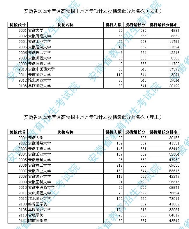 高校专项计划招生中,文理科投档线最高的均是安徽大学。其中文科580分,理科603分。8月17日、18日将进行录取。