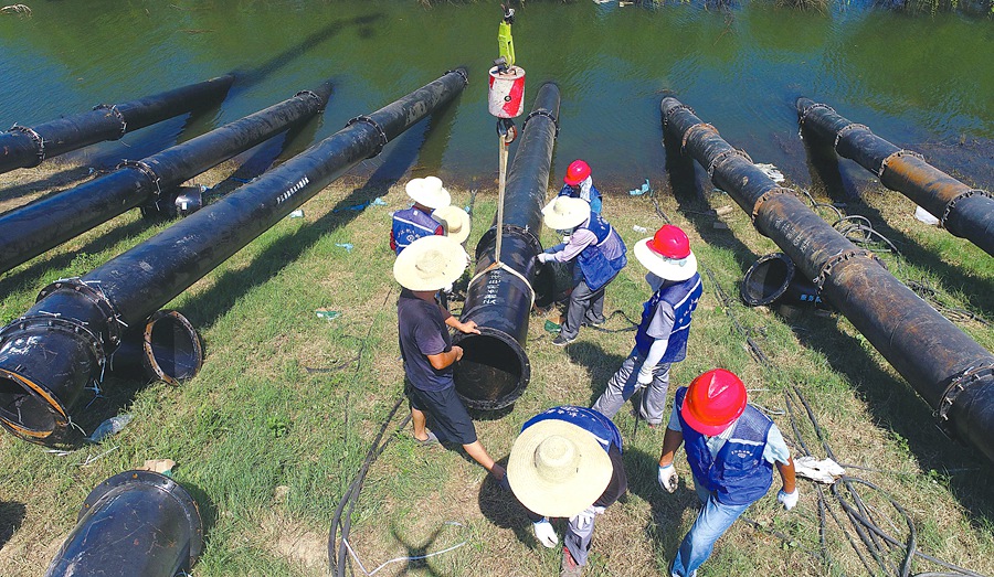 8月16日,庐江县机电排灌技术人员在牛广圩架设安装排水潜水泵。为早日恢复灾区群众生产生活秩序,该县机电排灌总站在两个圩区共设16个临时排水站,架设潜水泵240台(套)。目前,排水设备安装调试、供电系统保障等工作昼夜推进。通讯员 王闽/摄