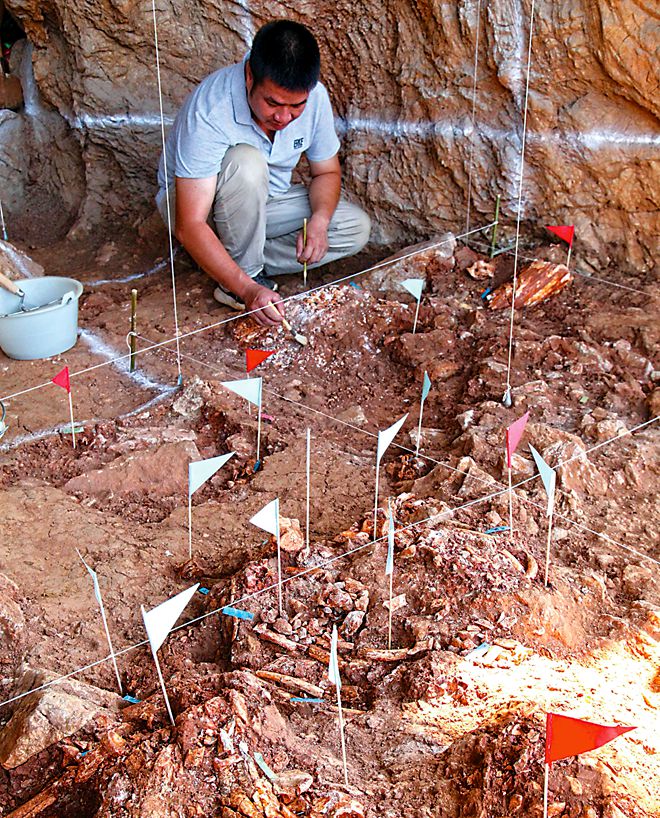 人字洞遗址距今200万年至260万年,是亚洲地区最古老的人类活动遗址之一。自1998年5月发现以来,先后进行了7次正式发掘。此次发掘将通过高科技手段,对遗址进行更加精确的测量和更加深入的研究。当日,“中科院古脊椎所人字洞科考工作站”和“中科院古脊椎所安徽繁昌科研科普基地”揭牌仪式在繁昌县举行。(通讯员 杨华 肖本祥 摄影报道)