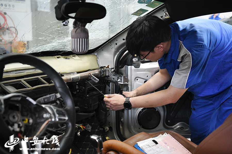 在门店后方,钣金学徒刘广勇正顶着高温对汽车的钣金零件进行拆卸、修复。与唐辰一样,他也是通过青年见习计划找到了毕业后的第一份正式工作。