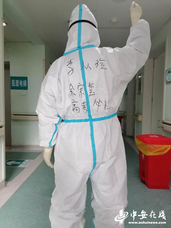李从玲在防护服上写上“余宗玺高考必胜”,为儿子加油