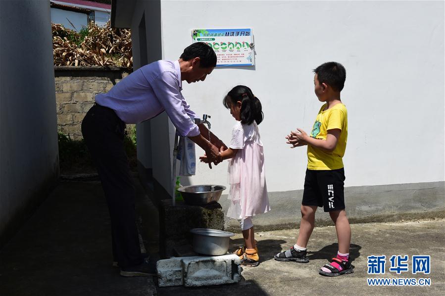 9月7日,在霍山县磨子潭镇金岩教学点,项发权在午饭前帮孩子们洗手。新华社记者黄博涵摄