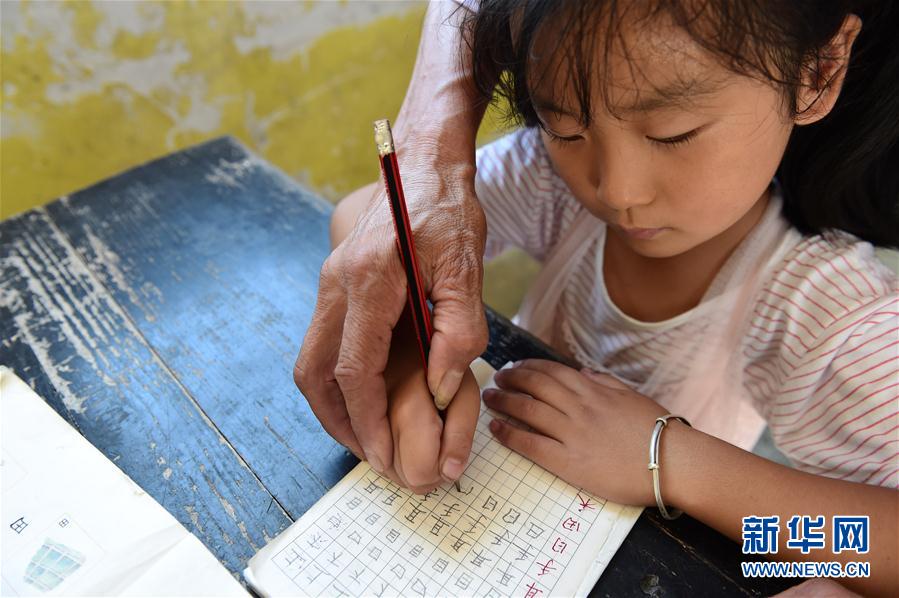 9月7日,在霍山县磨子潭镇金岩教学点,项发权教一年级的彭杭艳写字。新华社记者黄博涵摄