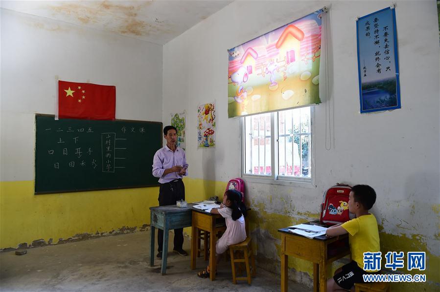 9月7日,在霍山县磨子潭镇金岩教学点,项发权给两个孩子上课。新华社记者黄博涵摄
