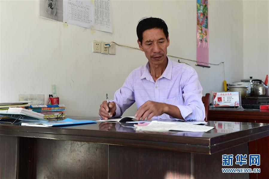 9月7日,在霍山县磨子潭镇金岩教学点,项发权在早读课时给学生批改作业。