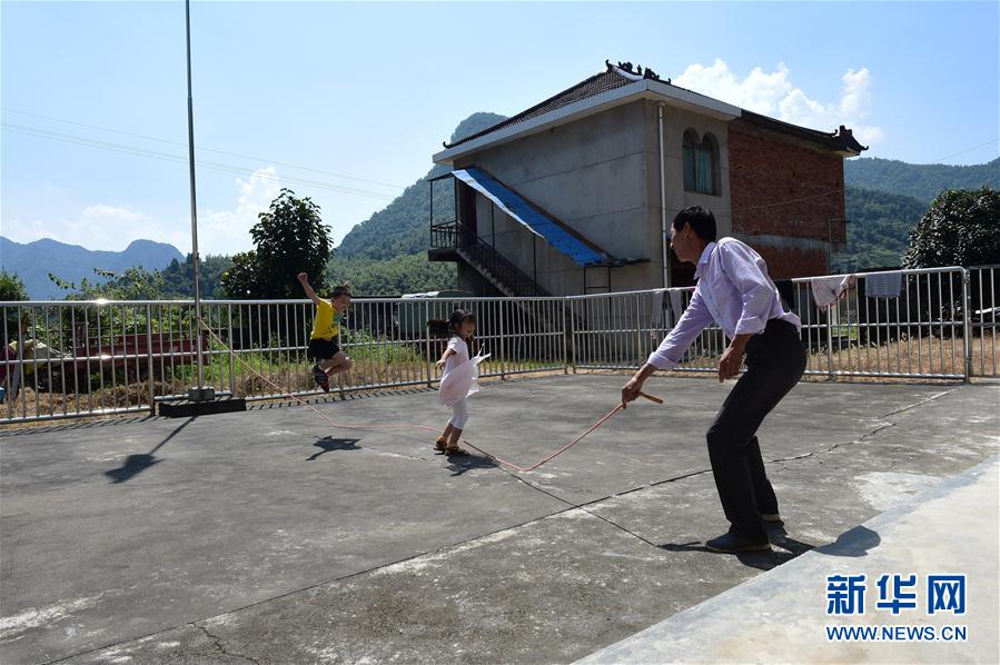 9月7日,在霍山县磨子潭镇金岩教学点,项发权在课间休息时带着孩子跳绳。 新华社记者黄博涵摄
