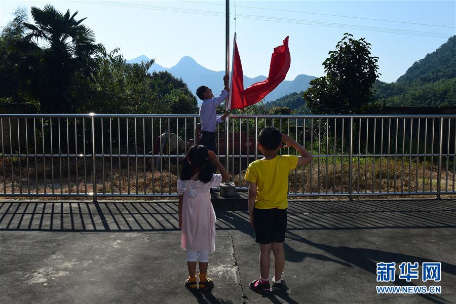 9月7日,在霍山县磨子潭镇金岩教学点,项发权带着两个孩子升国旗。 新华社记者黄博涵摄