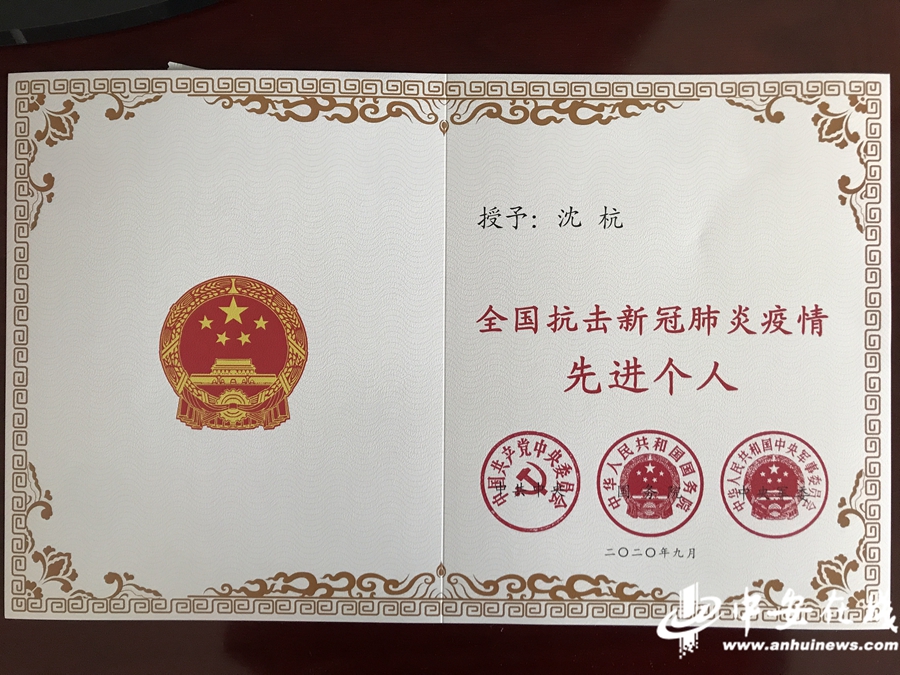 沈杭荣膺“全国抗击新冠肺炎疫情先进个人”