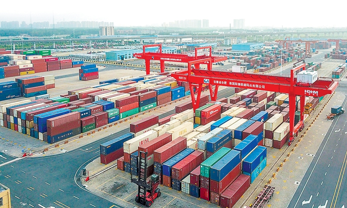 合肥港国际集装箱码头,货物运输一片繁忙。记者 李博 摄