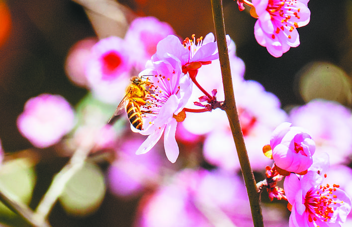 而在滨湖附近的金斗公园里,2016年建设的3万平方梅林,自2月15日起几千株梅花集中大规模开放。走入梅林,花开错落,暗香浮动。“梅林位于广西路和烟墩路交口附近,共包含了绿萼梅、玉蝶梅、朱砂梅、宫粉梅、红梅、美人梅等8个品种。”进入金斗公园,跨过长长的石板桥,隐约闻到梅花淡雅的香气,枝头挂着的朵朵梅花,既有冬的清冽,又有春的缤纷。据工作人员介绍,因为不同品种的梅花开放时间稍有不同,梅林中大约到3月底都可以探寻到梅花的影子。