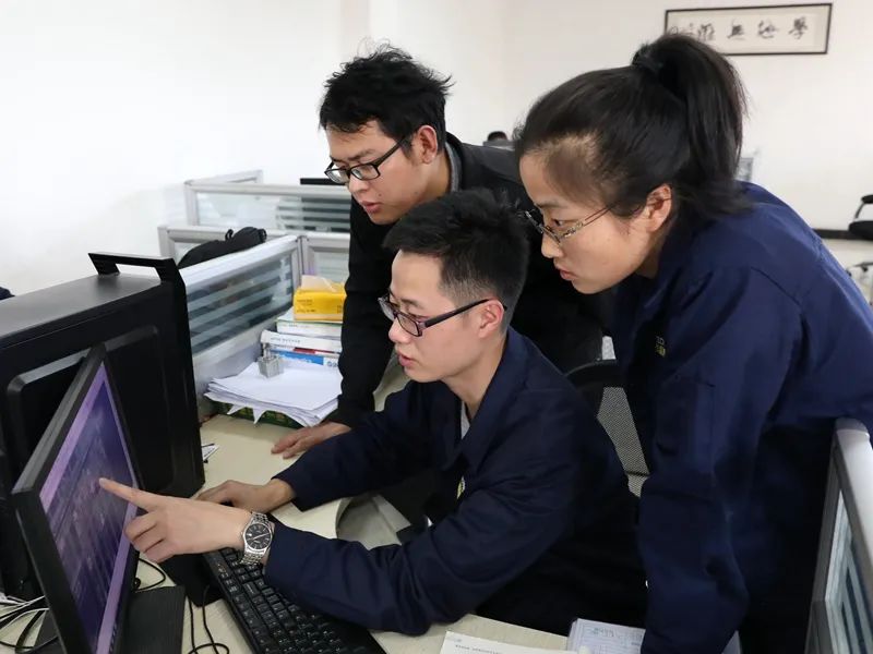 梅志平(中)正在向同事讲解技术难点