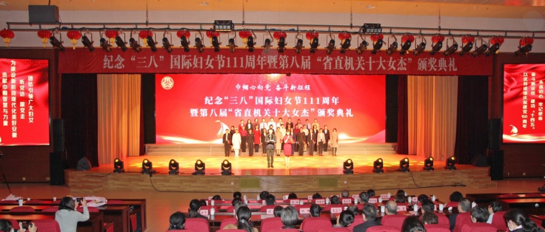 巾帼心向党、奋斗新征程。3月5日下午,纪念“三八”国际妇女节111周年暨第八届“省直机关十大女杰”颁奖典礼在省老年大学滨湖校区报告厅隆重举行。省直机关工委书记朱斌、省妇联主席刘苹、省委老干局局长夏小飞、省气象局局长胡雯、省直机关工委副书记朱宗庄、省妇联副主席张若平、省纪委监委信访室主任姚勤、省文化和旅游厅副厅长王靖等领导出席颁奖典礼并为获奖人员颁奖,省直有关单位领导嘉宾及各界妇女代表240余人参加了活动。