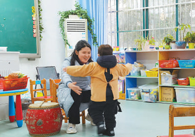 小朋(化名)患有孤独症,刚来学校时,周玲丽递给他一块积木,却被狠狠咬了一口。“牙印不浅,很疼。但我下意识的反应是抱住他,安慰他没事。”周玲丽说,看着孩子茫然无助的眼神,自己的心一下子就软了。如今,在走廊或教室相遇,小朋总会主动叫一声“周老师”。从一个牙印到一声呼唤的变化,对孤独症孩子来说十分难得。