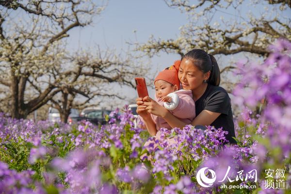 一位妈妈带着孩子在梨园内拍照。人民网 陈若天摄