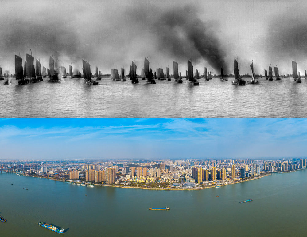 上图:渡江战役中长江江面千帆竞发;下图:如今在曾发生过战斗的长江安徽省芜湖段,沿江高楼林立、风景如画。