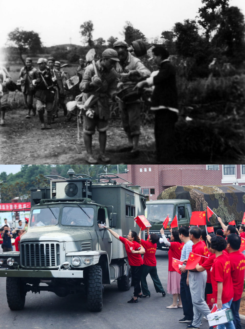 上图:当年江南人民欢迎解放军,老大娘给部队送水;