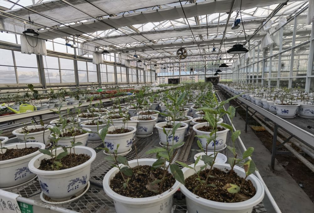 ↑在安徽农业大学茶树种植资源保护与利用温室里,种植着来自全国不同茶区的茶树。新华社记者 陈诺 摄
