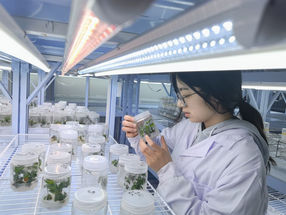 ↑植物组培室里,科研人员正在观察植株生长情况。新华社记者 陈诺 摄