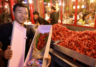 合肥市宁国路龙虾一条街,市民展示“龙虾花”。新华网发(程兆 摄)