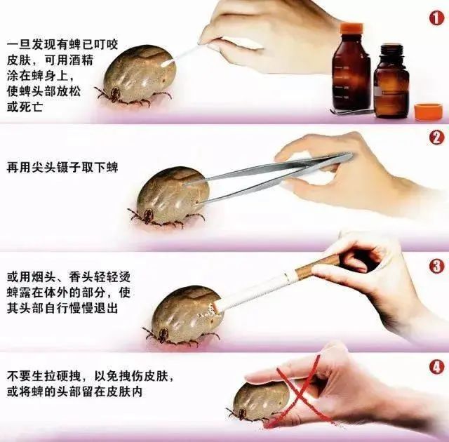 正确的做法是用酒精涂在蜱身上,使蜱头部放松或死亡,再用尖头镊子取下蜱;或用烟头、香头轻轻烫蜱露在体外的部分,使其头部自行慢慢退出。取出后,再用碘酒或酒精做局部消毒处理,并随时观察身体状况。拔出的蜱虫可以用火烧掉。(记者 徐慧媛)