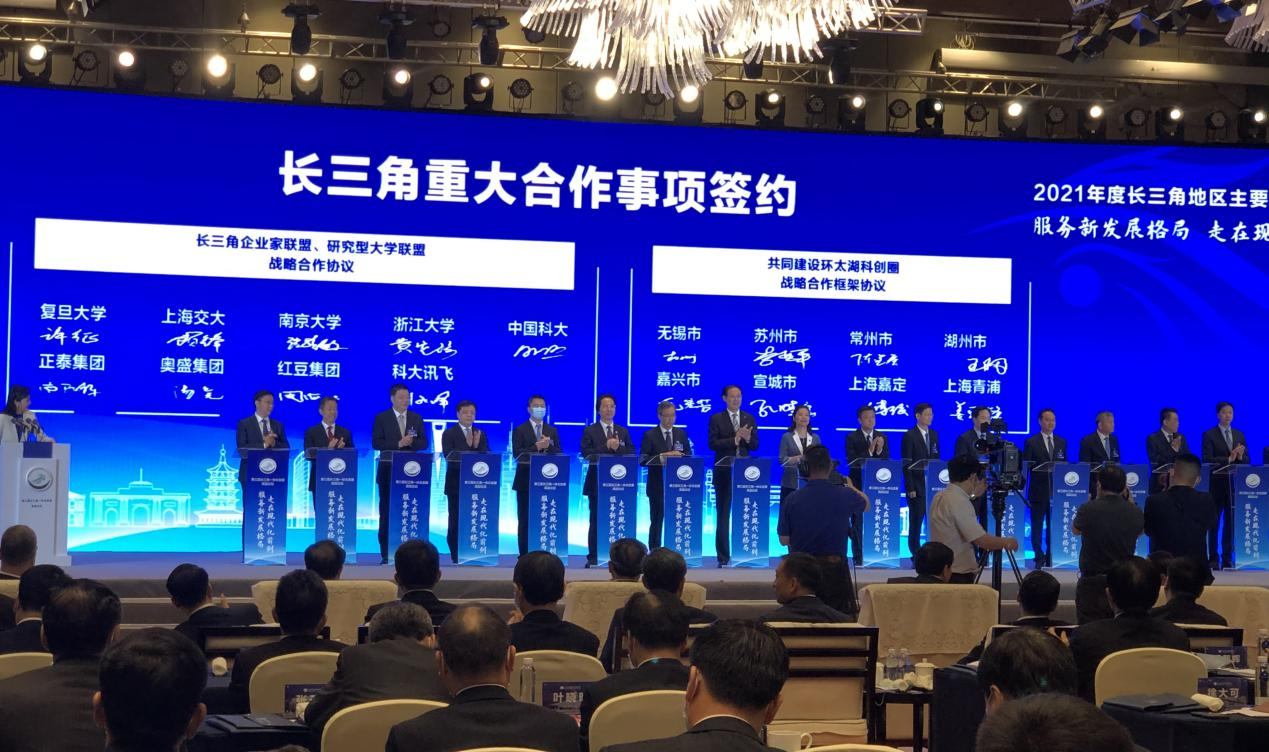 大会现场,长三角企业家联盟与长三角研究型大学联盟签署战略合作协议,长三角企业家联盟联席主席、科大讯飞董事长刘庆峰出席签约。两大联盟将重点围绕联盟协同、创新赋能、人才引领和智力支持四个方面展开合作,促进教育链、创新链与产业链深度融合,共同打造具有重要影响力的创新策源地、人才蓄水池和智慧萌发库,推动长三角一体化高质量发展。